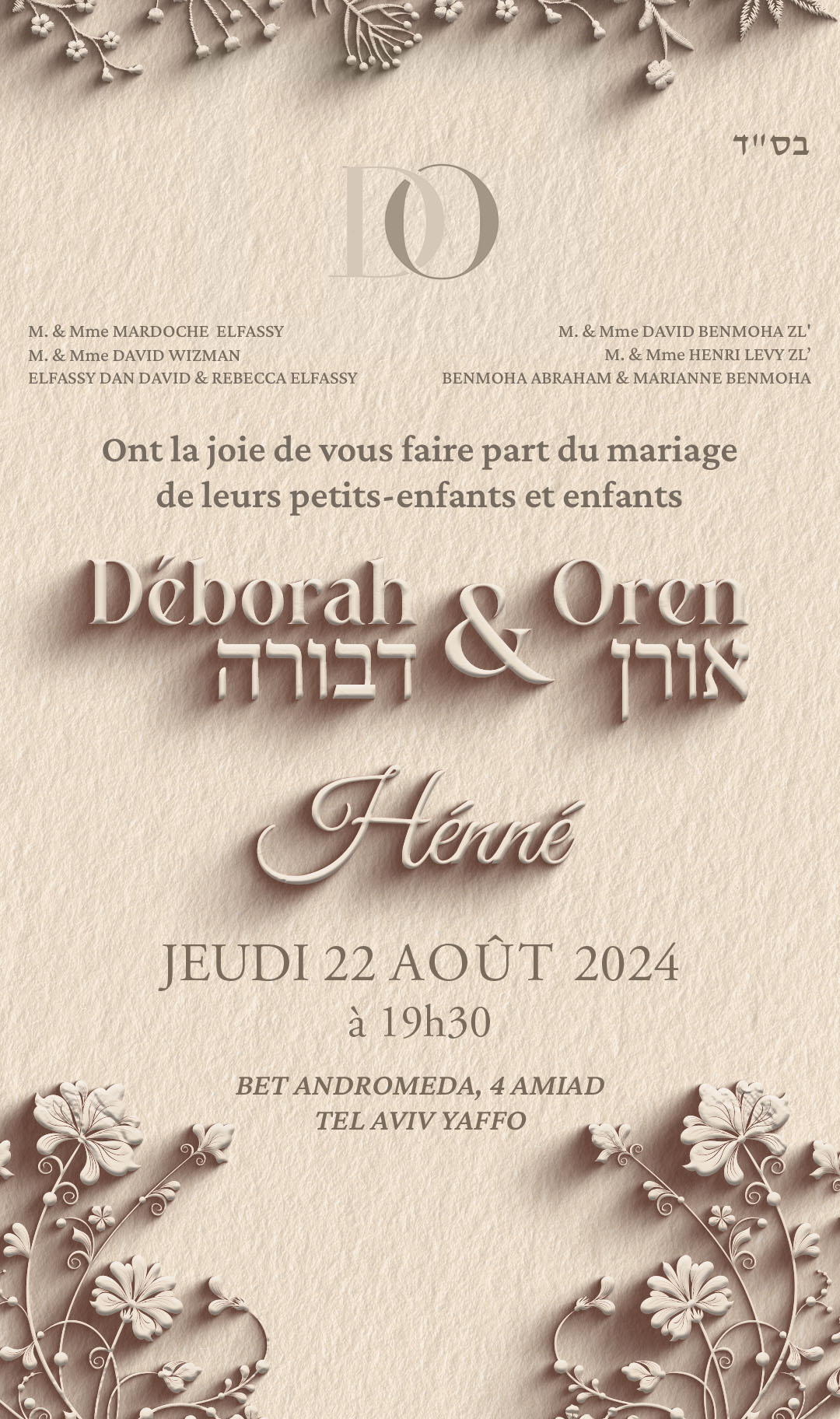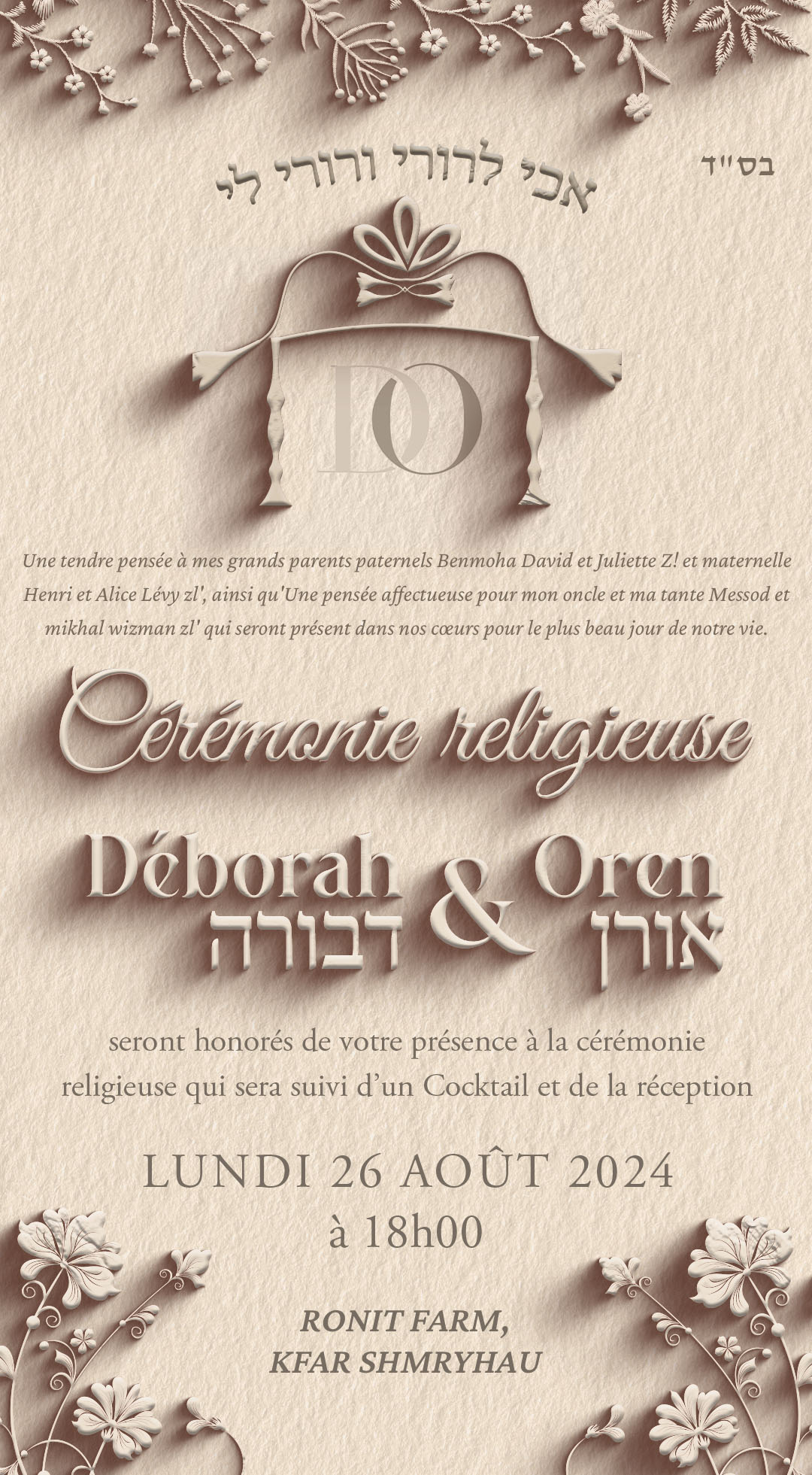 Maitre du monde, Tu nous a plusieurs fois montré que le monde ne pouvait pas tenir sans notre amour. Nos yeux brillent, nos cœurs palpitent et nos ambitions se rejoignent. L’ange nous a finalement retrouvé et ce grâce à Ta volonté divine. Aujourd’hui est un grand jour, Oren et moi Te disons Merci. Rendez-vous dans Ton Royaume pour s’unir à jamais